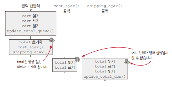 이렇게 타임라인 다이어그램을 그려서 보니 문제점이 눈에 보이기 시작한다. cost_ajax 콜백과 shipping_ajax 콜백중 어느것이 먼저 실행될 지 알수가 없다.