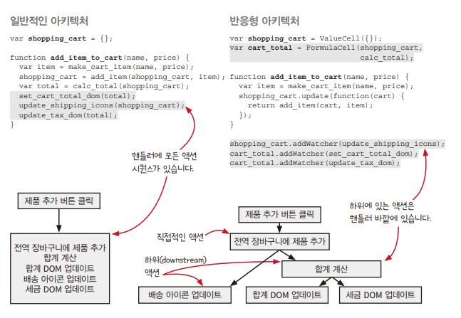 고친 함수는 클릭 핸들러가 더 간결해 졌음을 볼 수 있다. 이제 장바구니가 바뀔 때 항상 DOM 3개가 갱신된다. 일반적인 아키텍처와 반응형 아키텍쳐를 비교해보자.