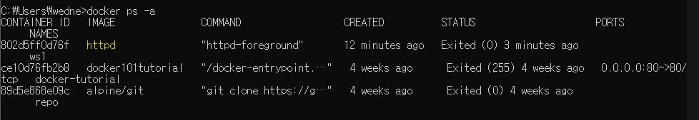 docker ps -a 명령어로 확인해보면 컨테이너가 삭제됐음을 볼 수 있다.