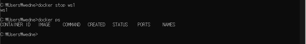 중지 명령어를 적고 ps를 찍어보면 해당 컨테이너가 더이상 보이지 않게 된다.