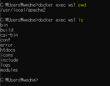 컨테이너에 pwd와 ls 명령을 전달했을 때 결과이다. 그때마다 exec ws1 ... 와 같이 써야할 것이다.
